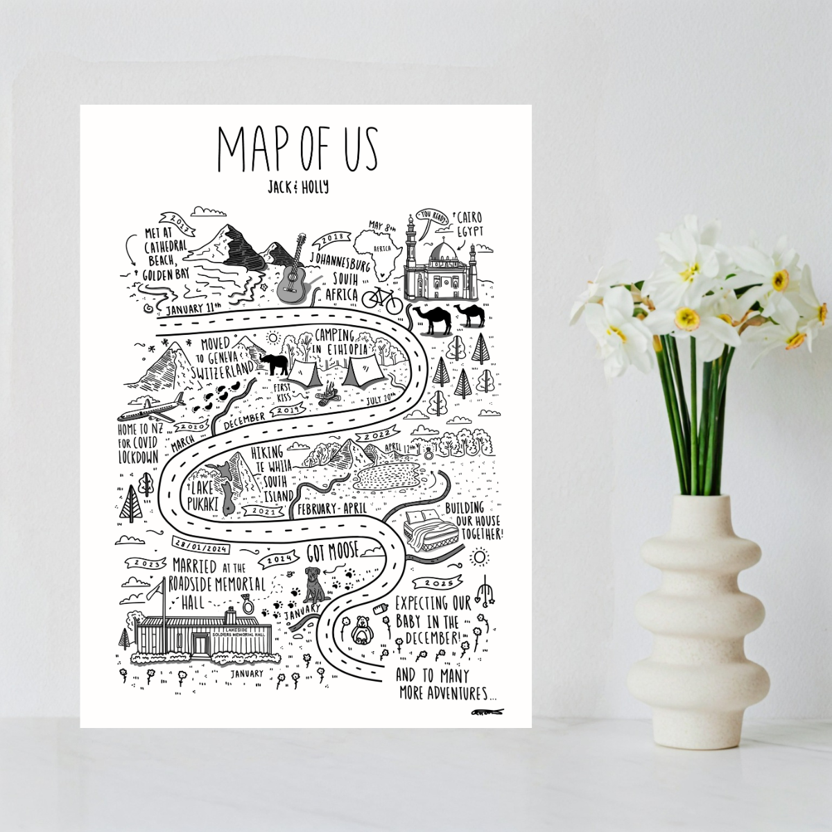 Your love story is more than just a few moments—it’s an adventure. Further More is designed for couples who have shared years of memories together, weaving their story across time and places. This custom relationship journey map highlights 12 of the most defining moments of your relationship—whether it’s moving in together, traveling the world, or celebrating major milestones.